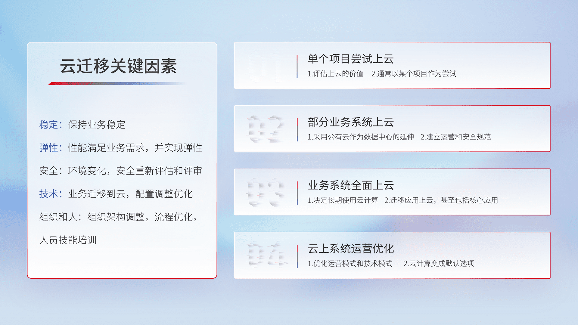 结合实际业务,,,从规划设计、、云平台选型、、、云原生改造、、数据迁移、、集成交付,,,迁移全过程为客户识别最佳上云路径,,,,做好风险识别管理,,,,设计网络架构、、、、身份权限、、安全审计合规、、、操作审计、、日志审计、、、监控告警策略、、多站点容灾设计等,,,,对云上基础设施进行整体规划,,提升IT治理水平,,,,以满足弹性、、、高可用、、、高性能的需求。。。。