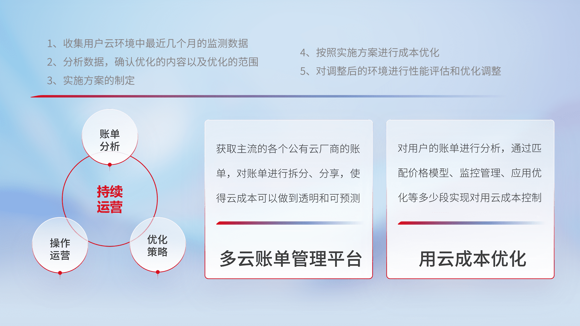 通过多云纳管,,,,以统一的资源数据模型把客户的云资源进行抽象和封装,,,,进而实现对多云资源的统一操作,,,,保障云资源管理的可靠性、、、、稳定性与可用性。。。。量身定制化运维内容,,配置、、开发运维、、、、补丁管理、、、备份、、监控、、、、认证和访问管理、、审计和日常巡检等,,保障在用云过程中的可靠度,,稳定度以及高可用率。。。。
